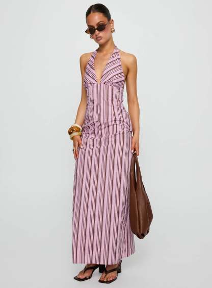 Avrie Halter Maxi Dress Pink / Brown Stripe