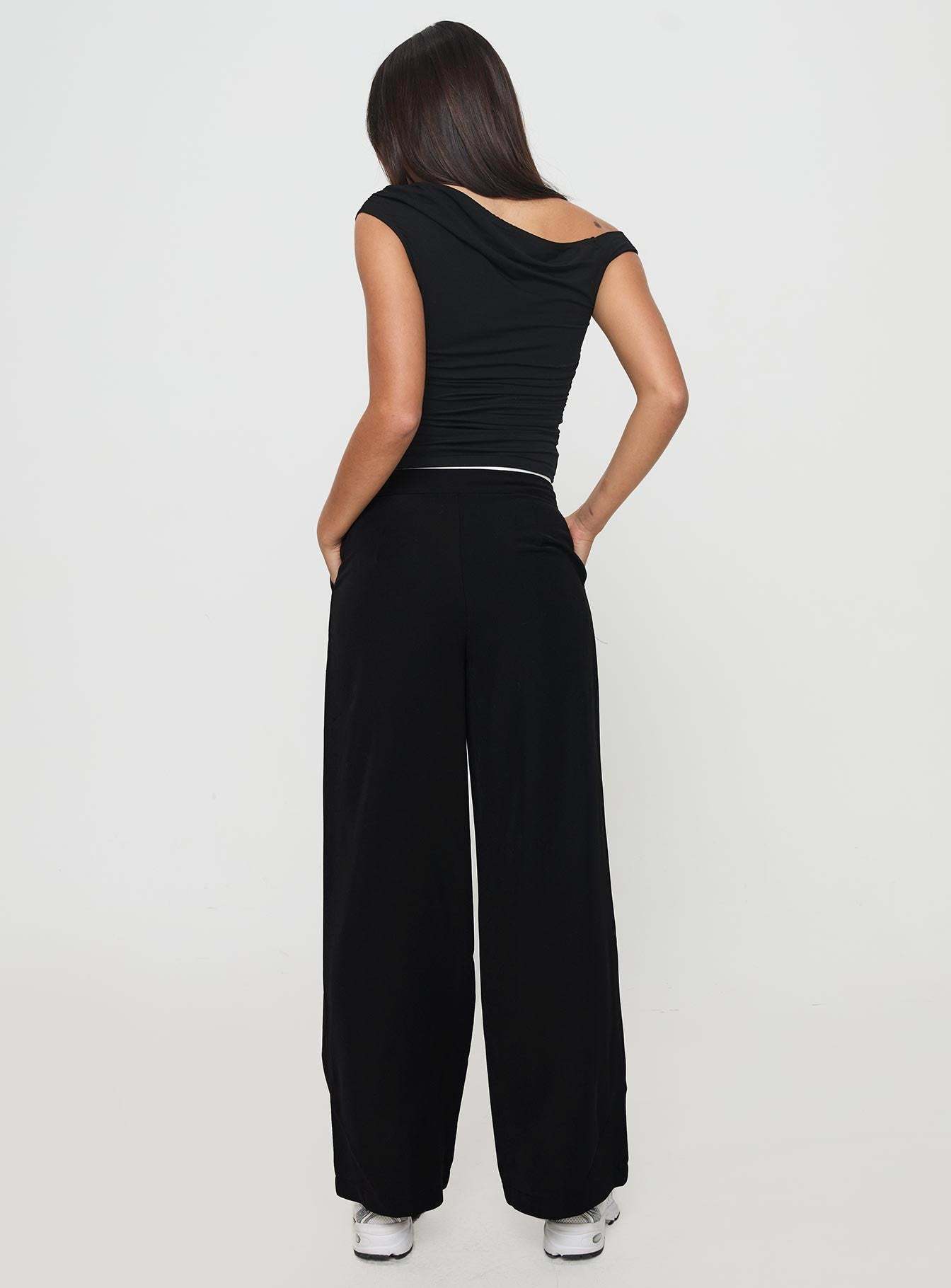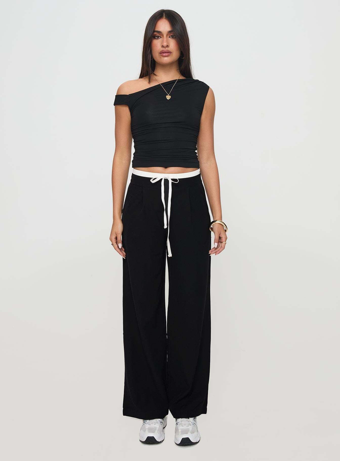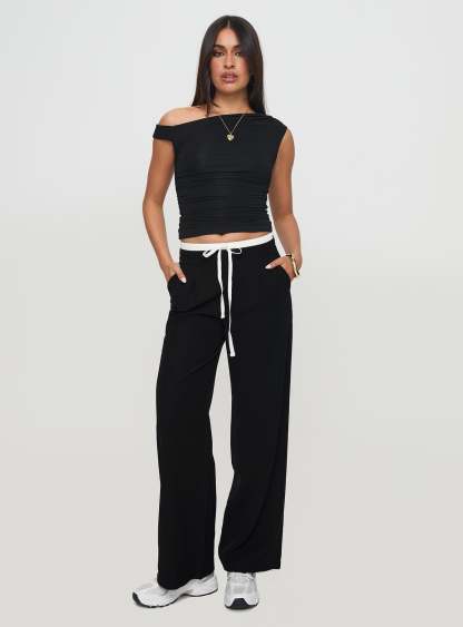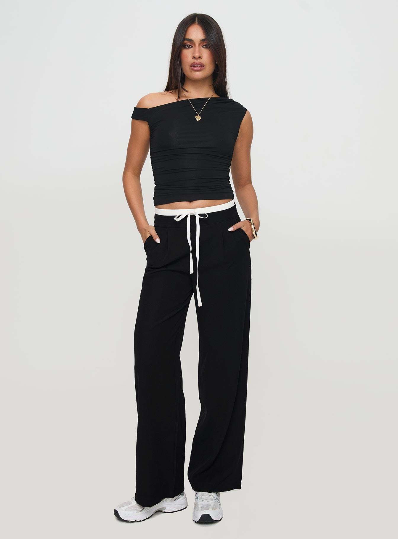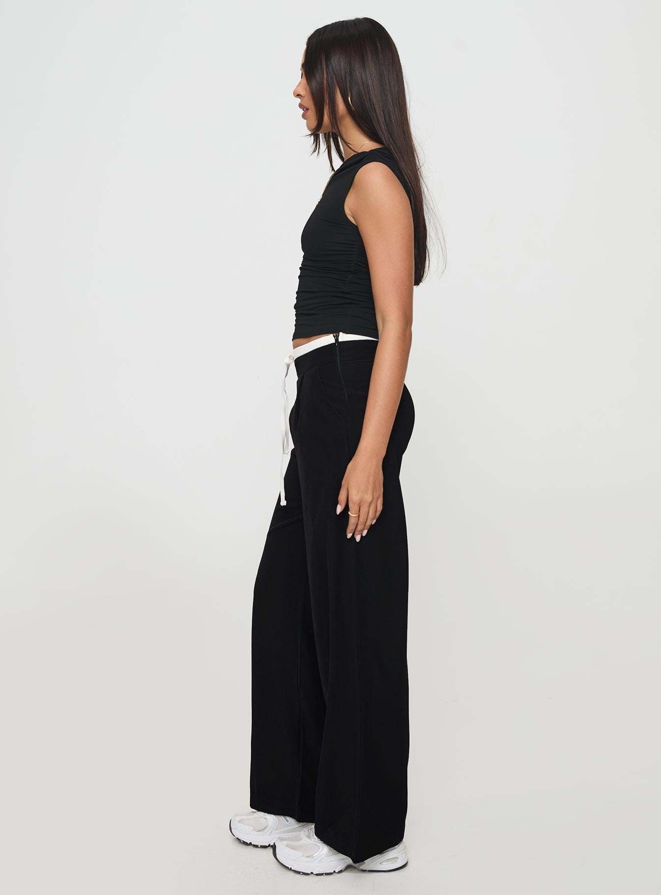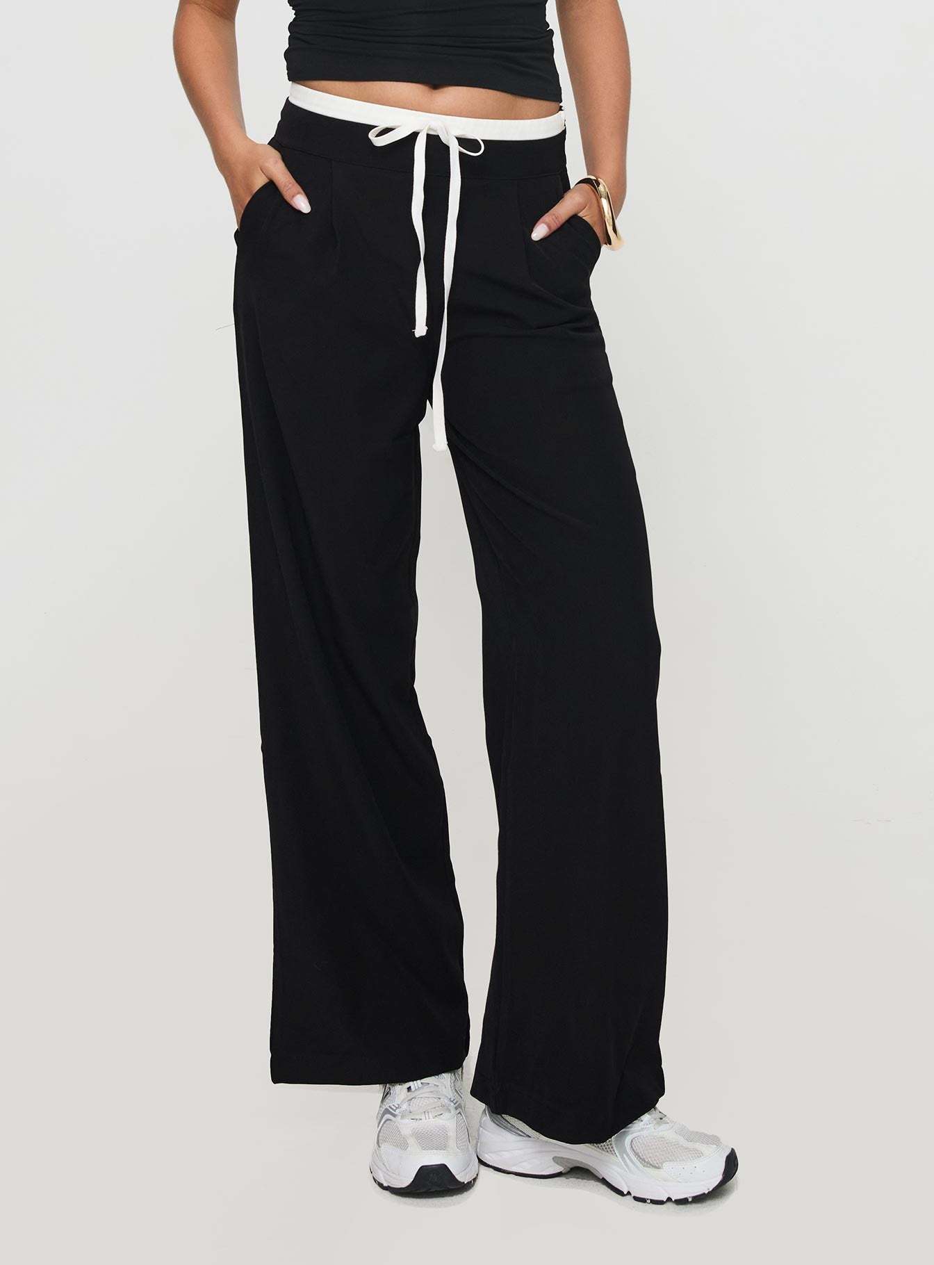 Elasticated waistband with tie fastening. two hip pockets. invisible zip fastening at side. mid-rise fit