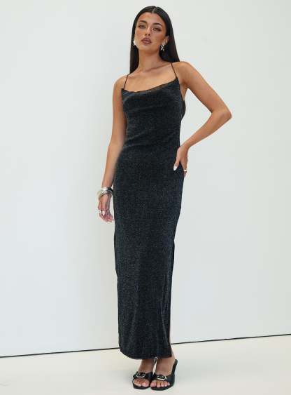 Cowl neckline. adjustable straps. leg split. cross tie back closure