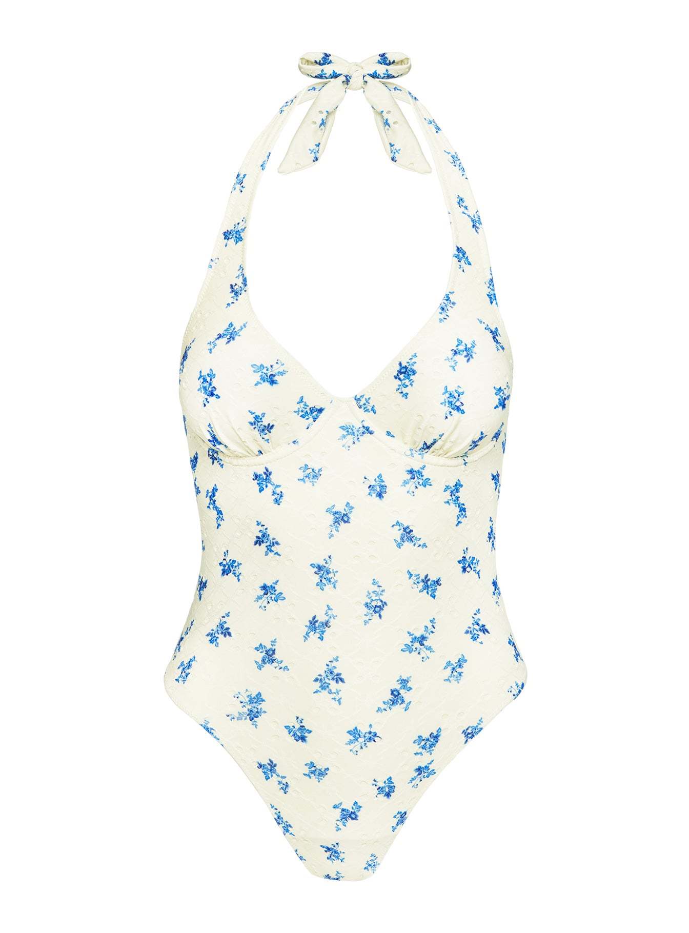 • Scooped neckline. adjustable halter straps. high leg cut. cheeky bottom