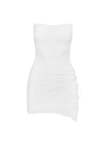 Lace material. inner silicone strip at bust. ruching with elasticated drawstring at side. asymmetric hem