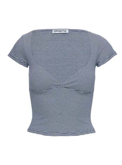 Stripe print. ruched bust. cap sleeves. cropped