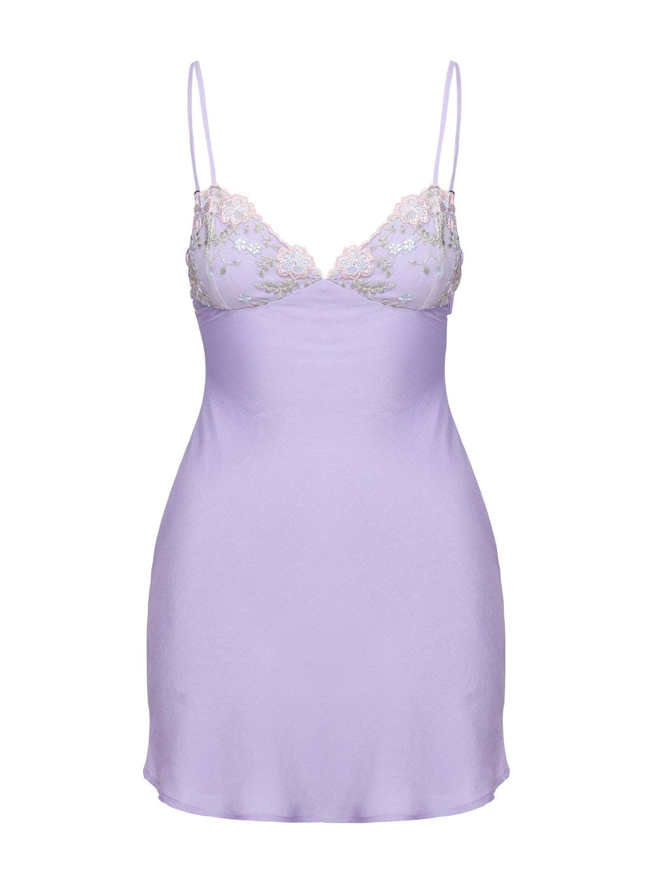 Lace trim detail. v-neckline. floral embroidered detail. invisible zip at side. adjustable straps