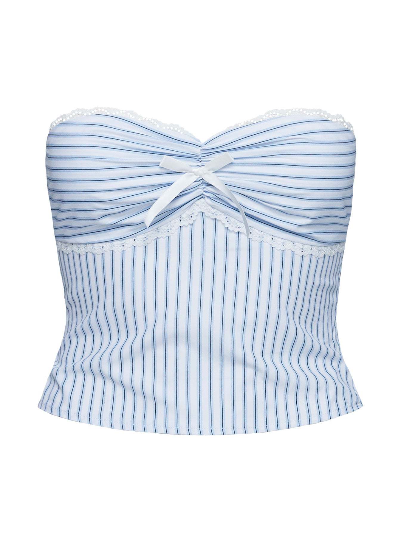 • Sweetheart neckline. pinched bust. bow detail. lace trim. invisible zip fastening at side. elasticated band at back. crop fit