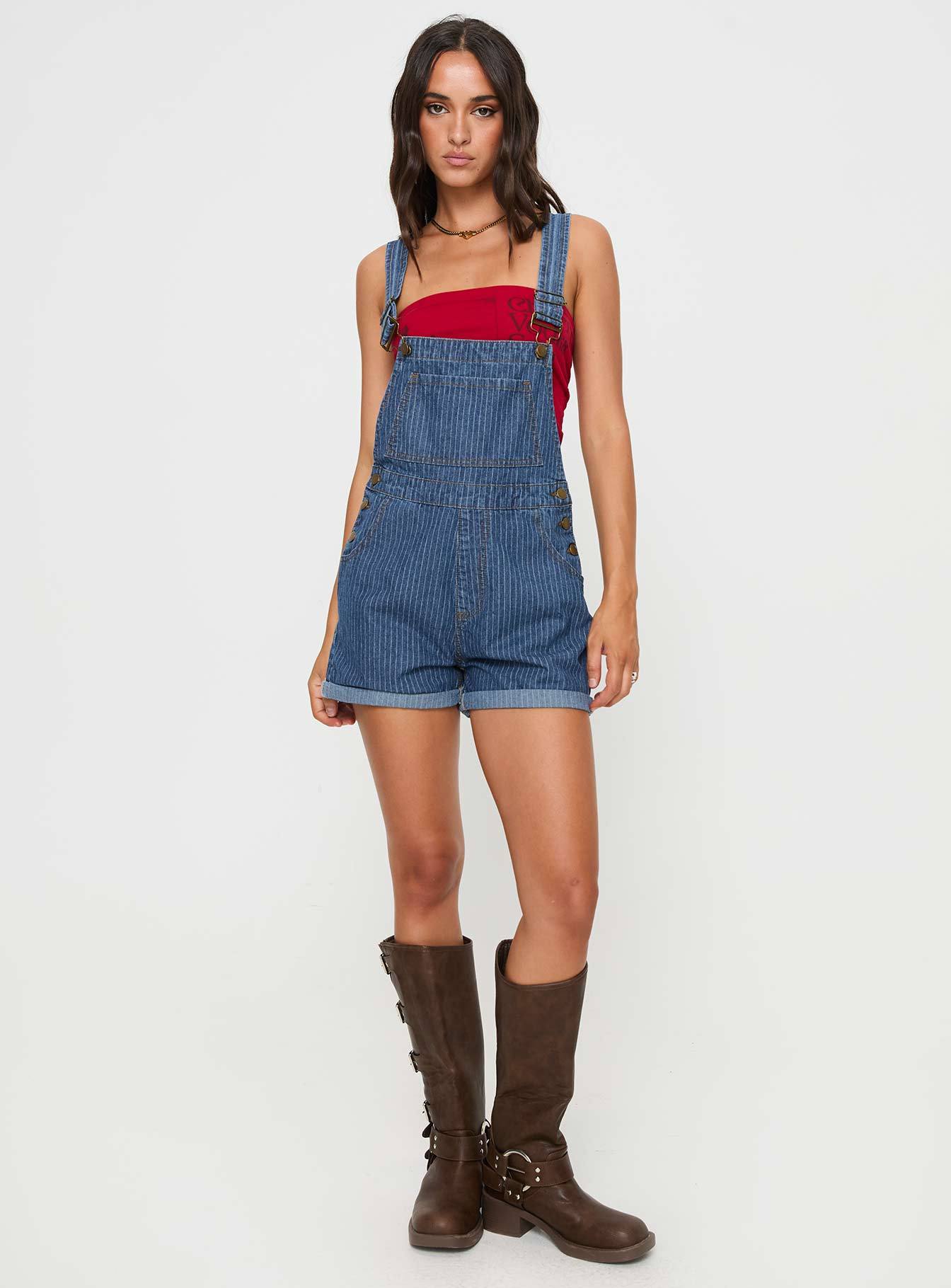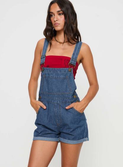 Kacey Short Overalls Mid Blue Pinstripe