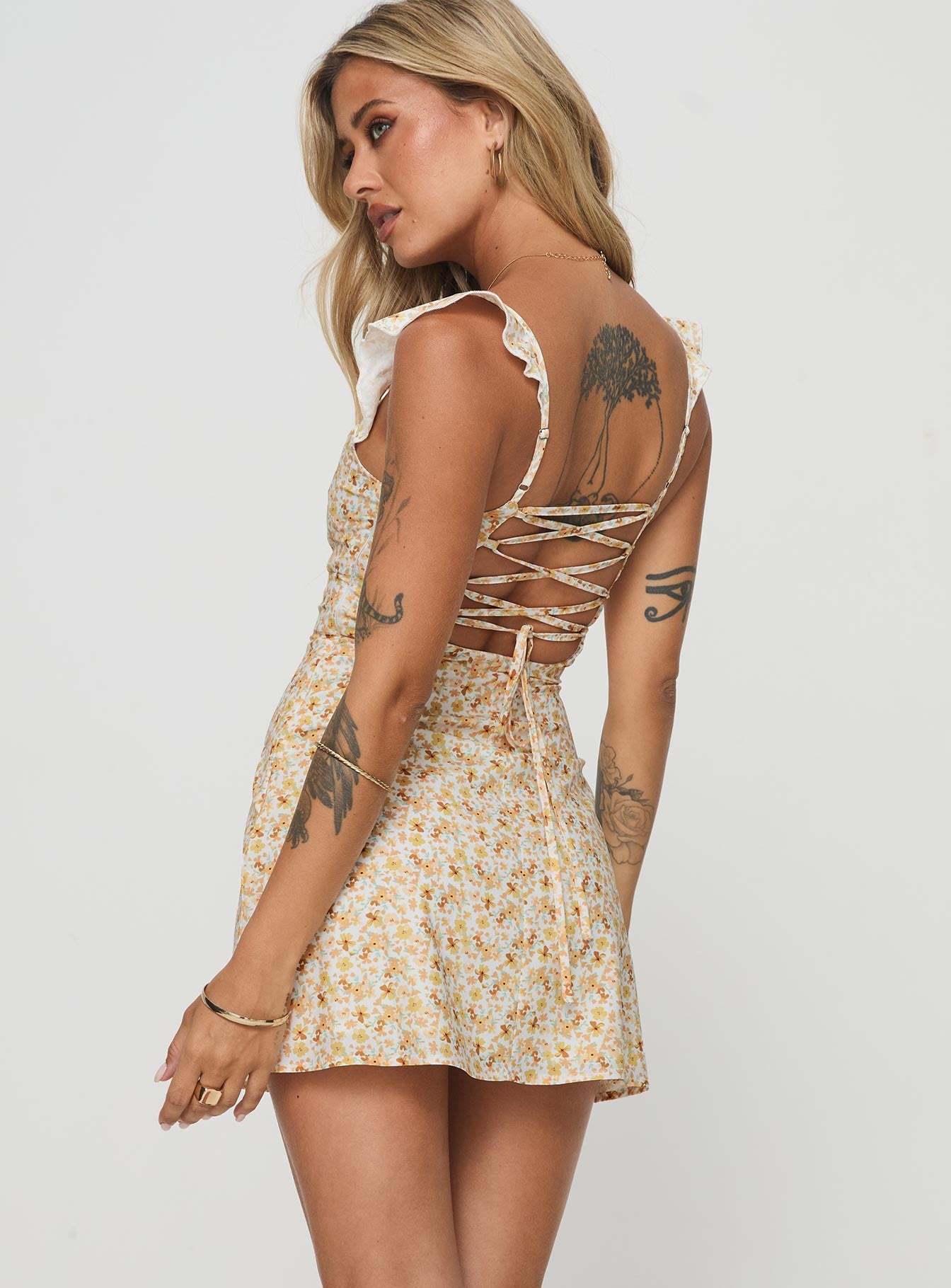 • Floral lace-up back mini dress