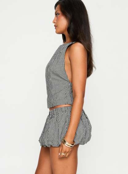 Sleeveless top. boat neckline. exposed back with cross design & bow detail. micro shorts. elasticated waist. built-in shorts. mid-rise fit