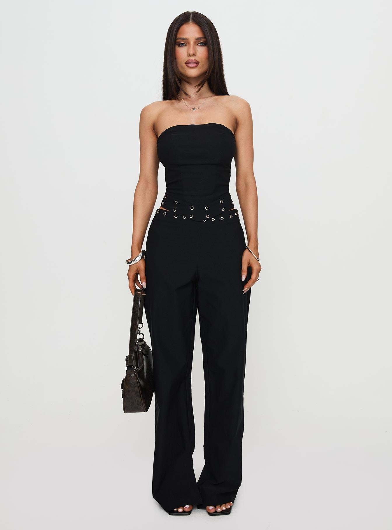 • Eyelet waist detail. invisible zip fastening at side. straight leg
