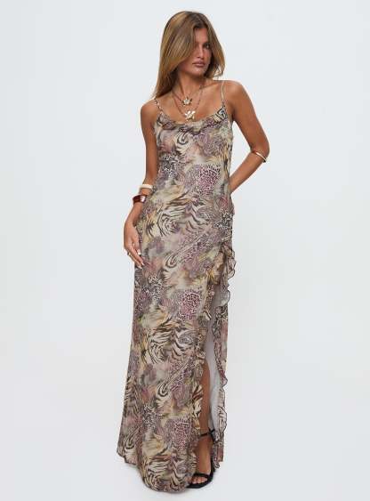 Multi-print design. scooped neckline. invisible zipper on side. open back design with tie closure